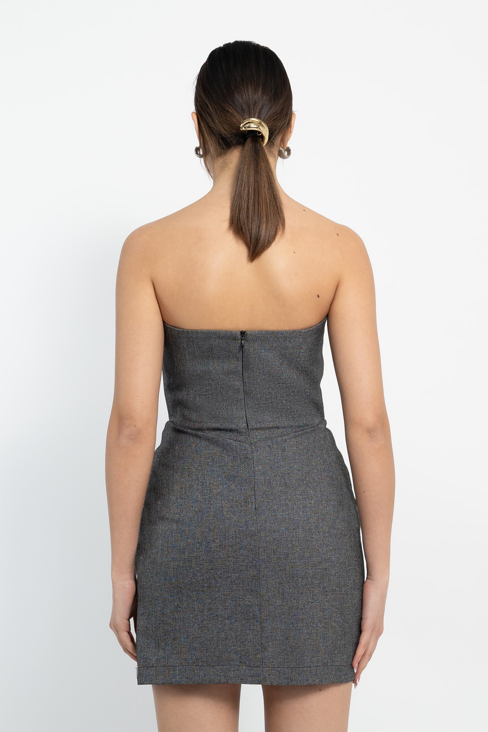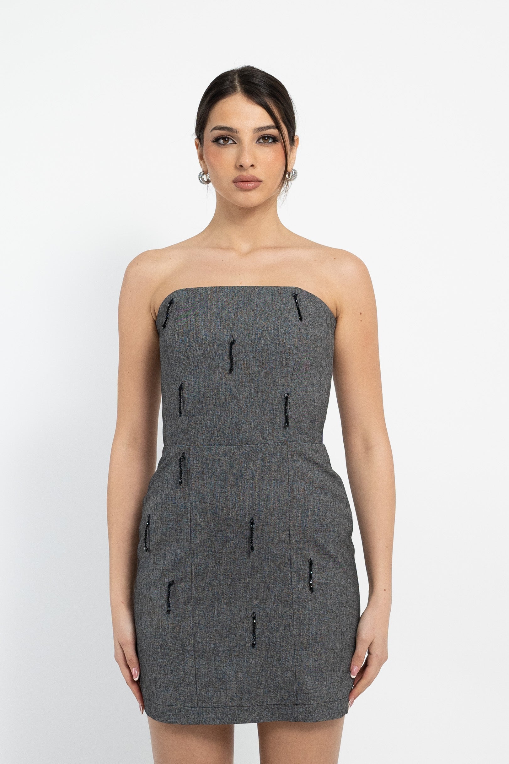 Abito mini in tessuto sale e pepe, con scollo quadrato, applicazioni pendenti neri e zip sul centro dietro.