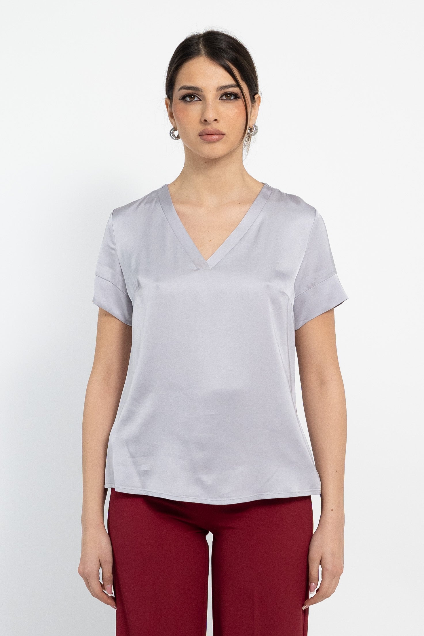 Blusa basica in raso di viscosa con scollo a V, mezza manica e stondatura sul dietro.