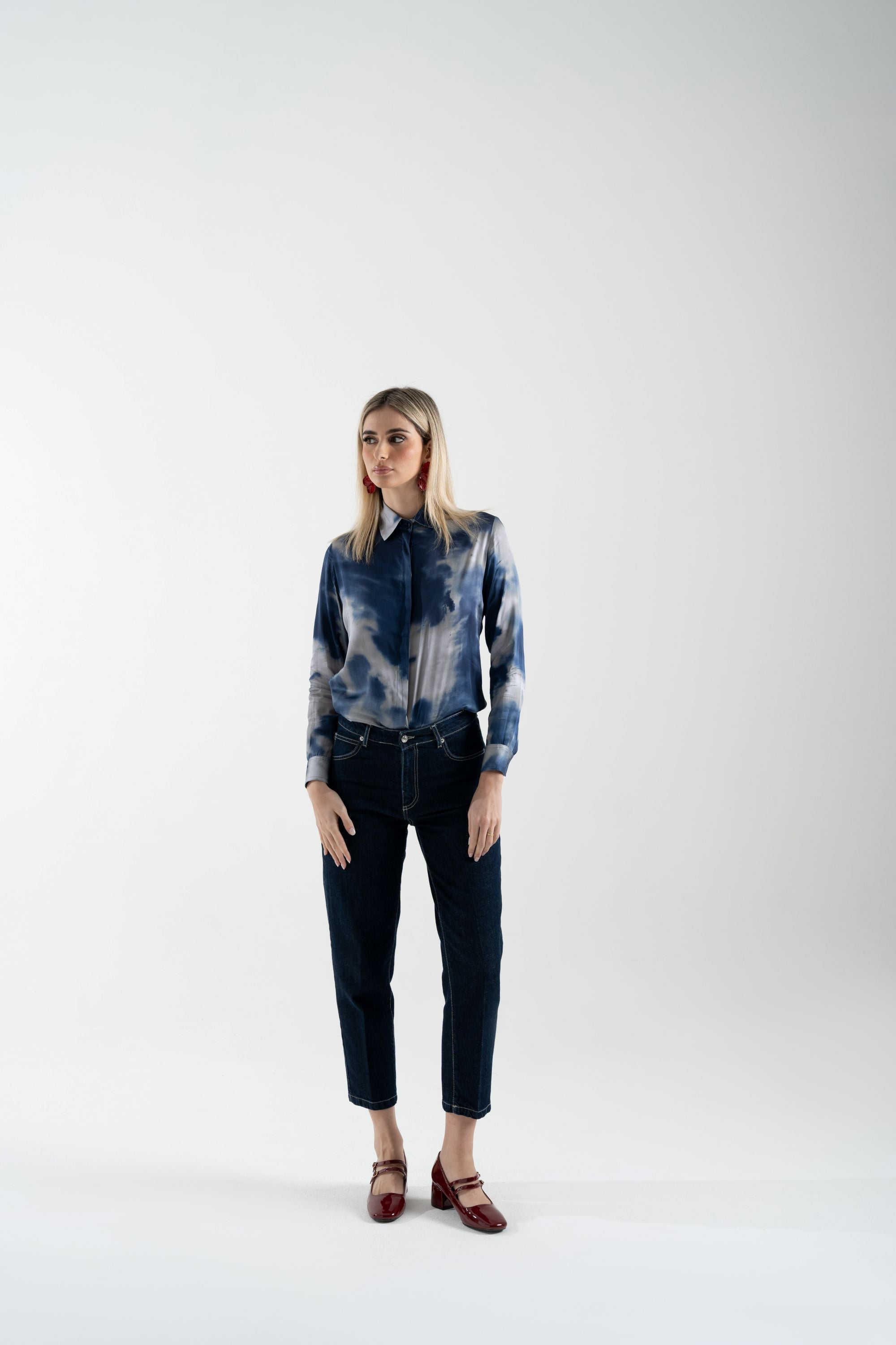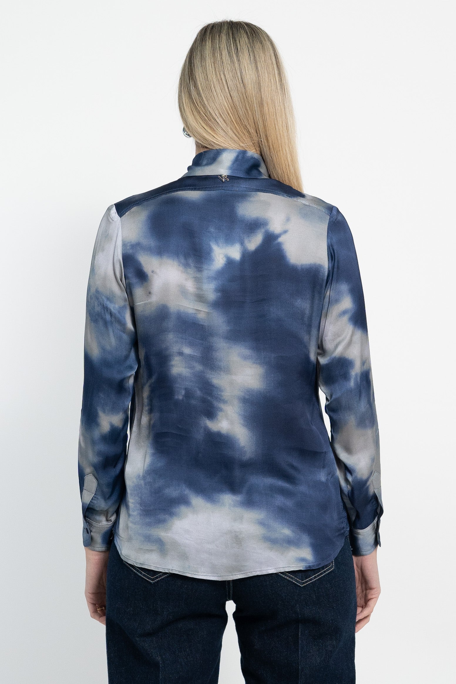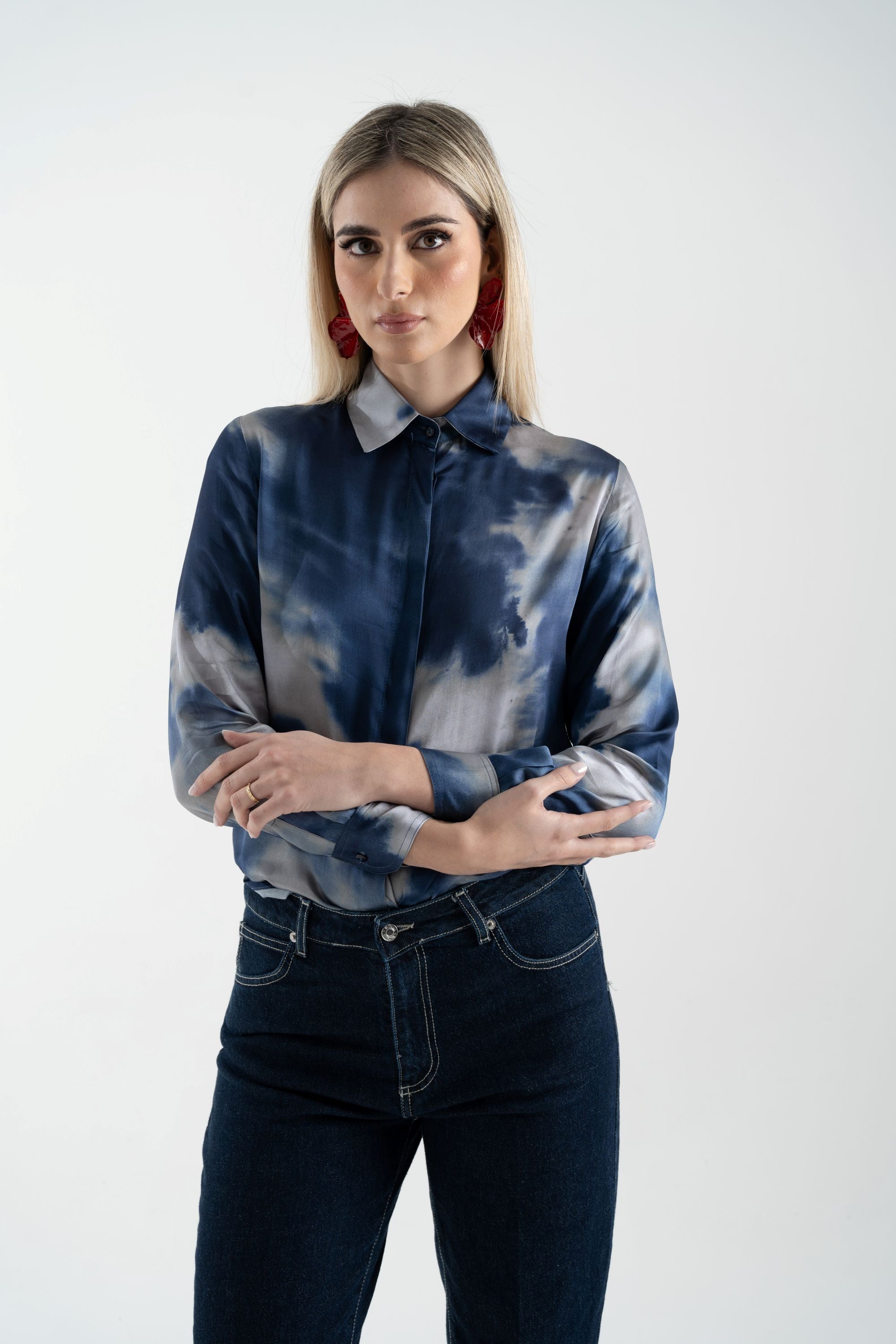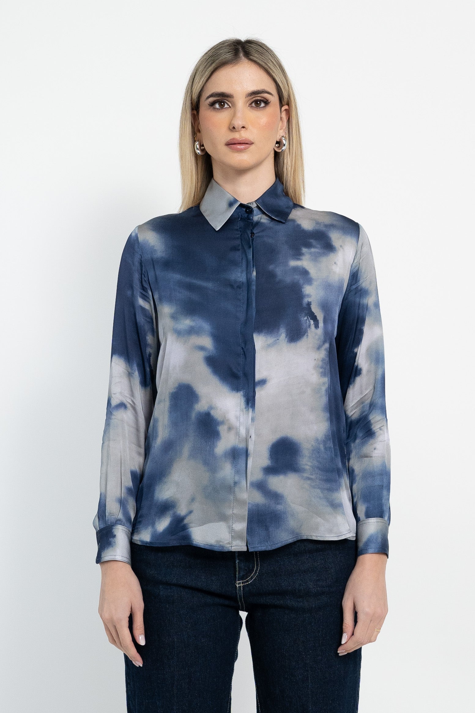 Camicia basica in raso di viscosa stampato con bottoncini ricoperti in tessuto.