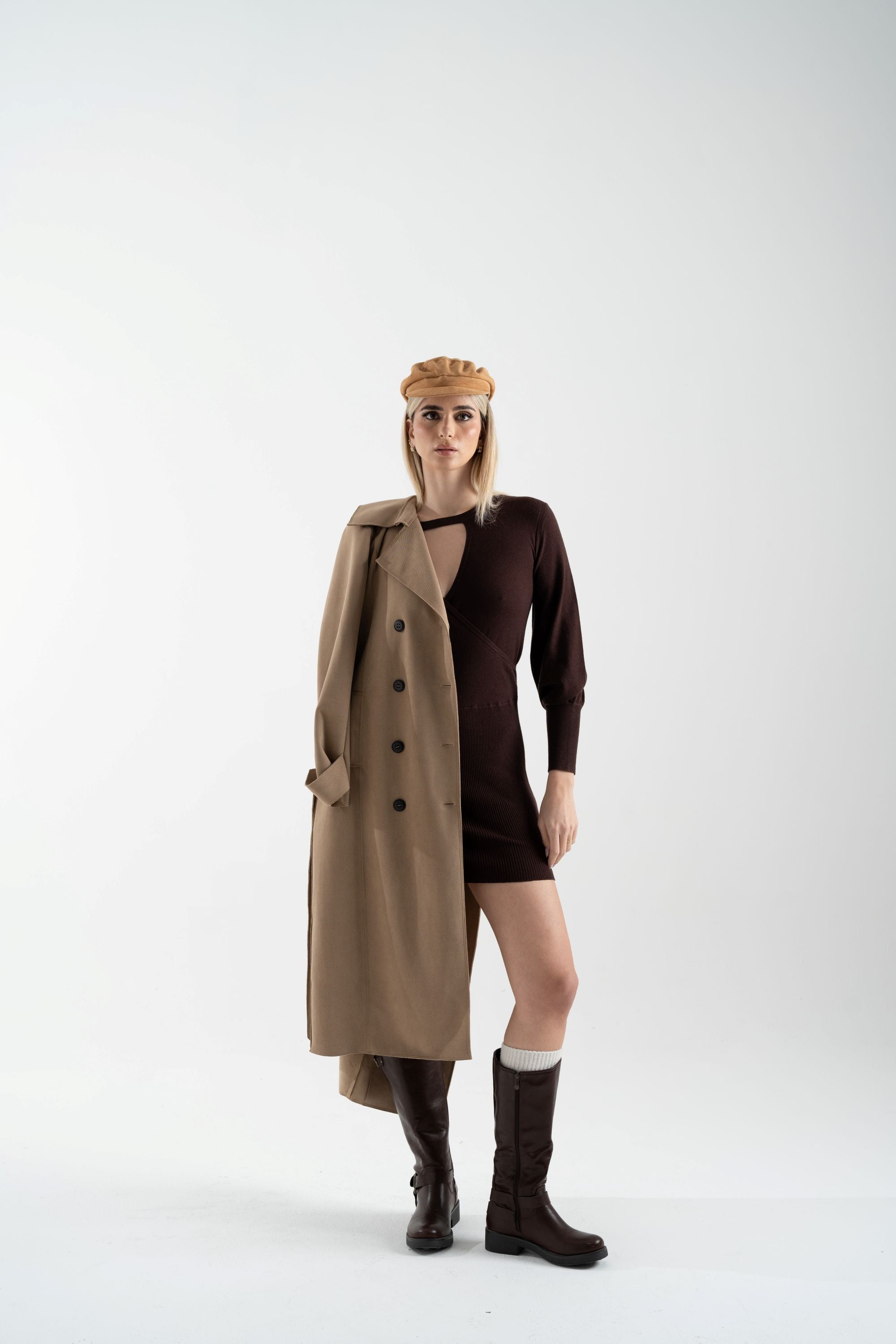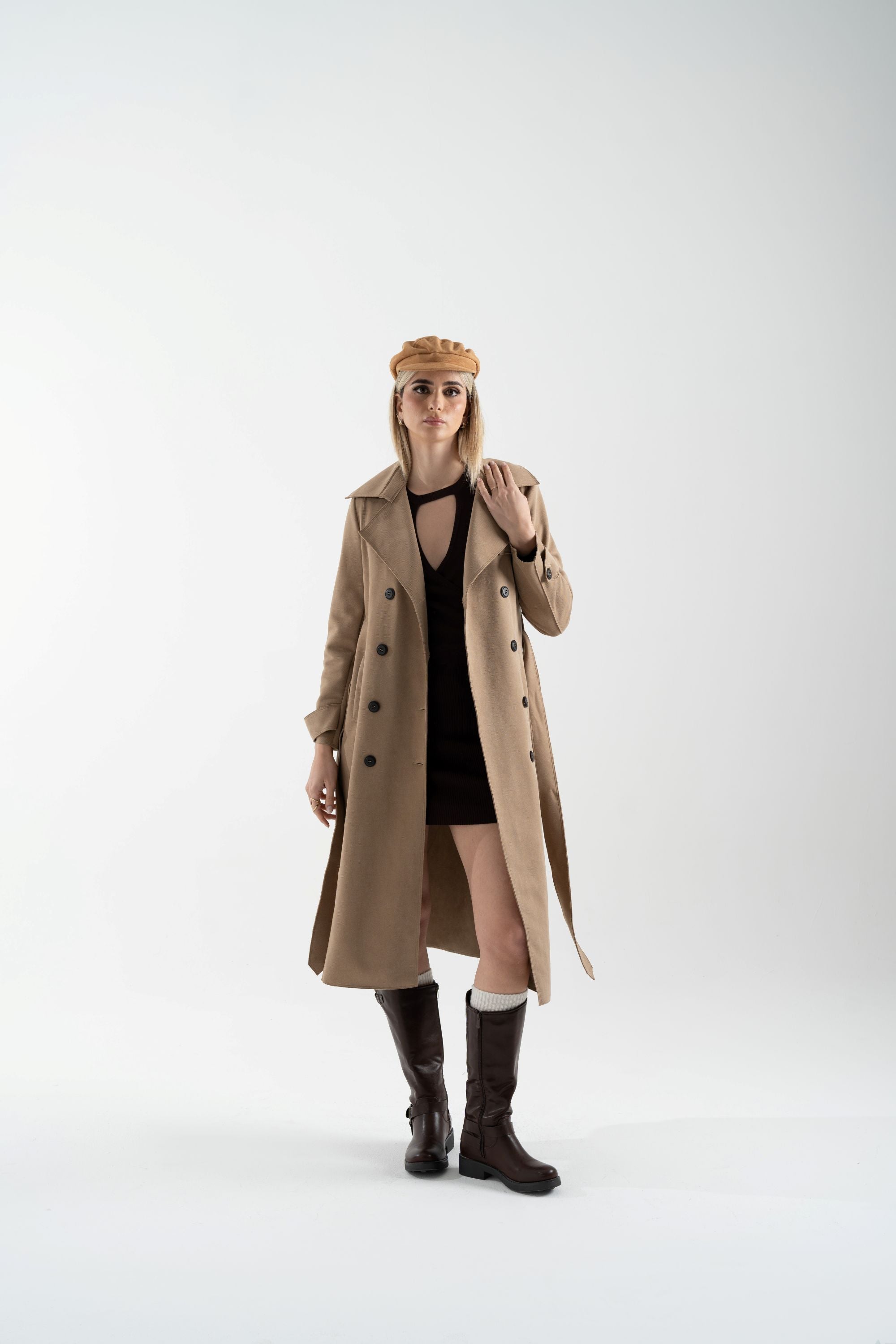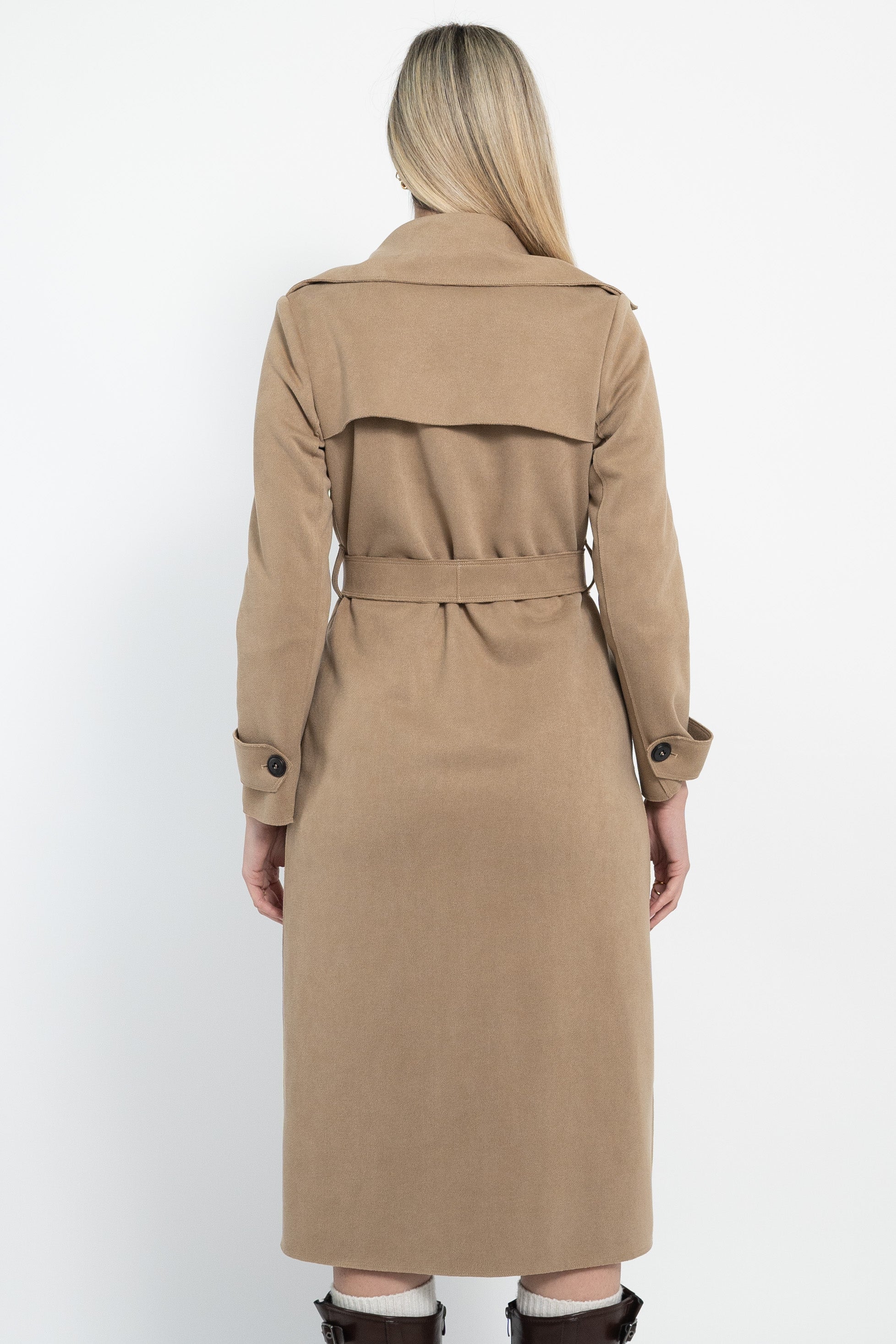 Trench lungo doppiopetto in camoscio diagonale, con cintura in vita e passanti, tasca a friso, alette su manica e carrè sul dietro.
