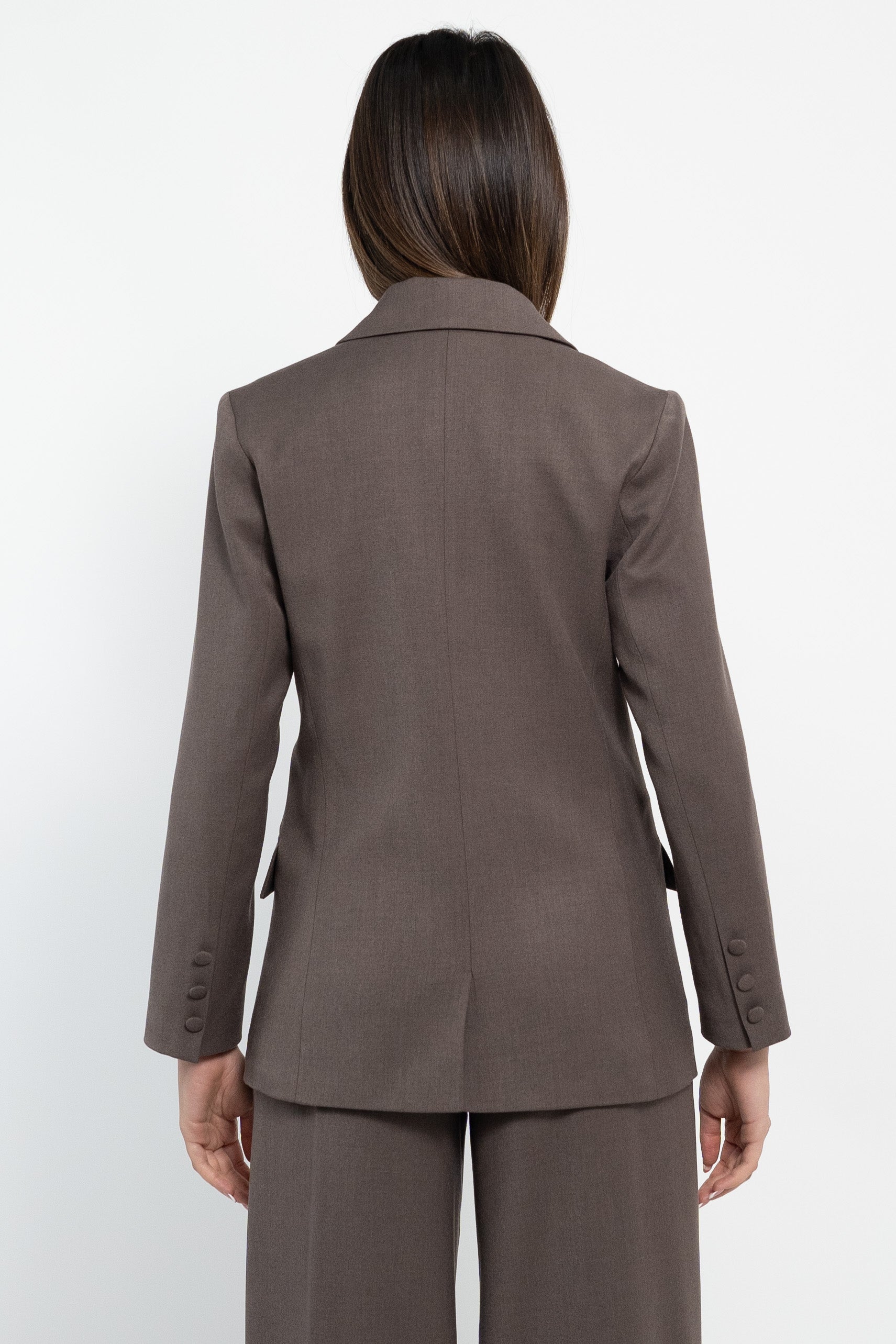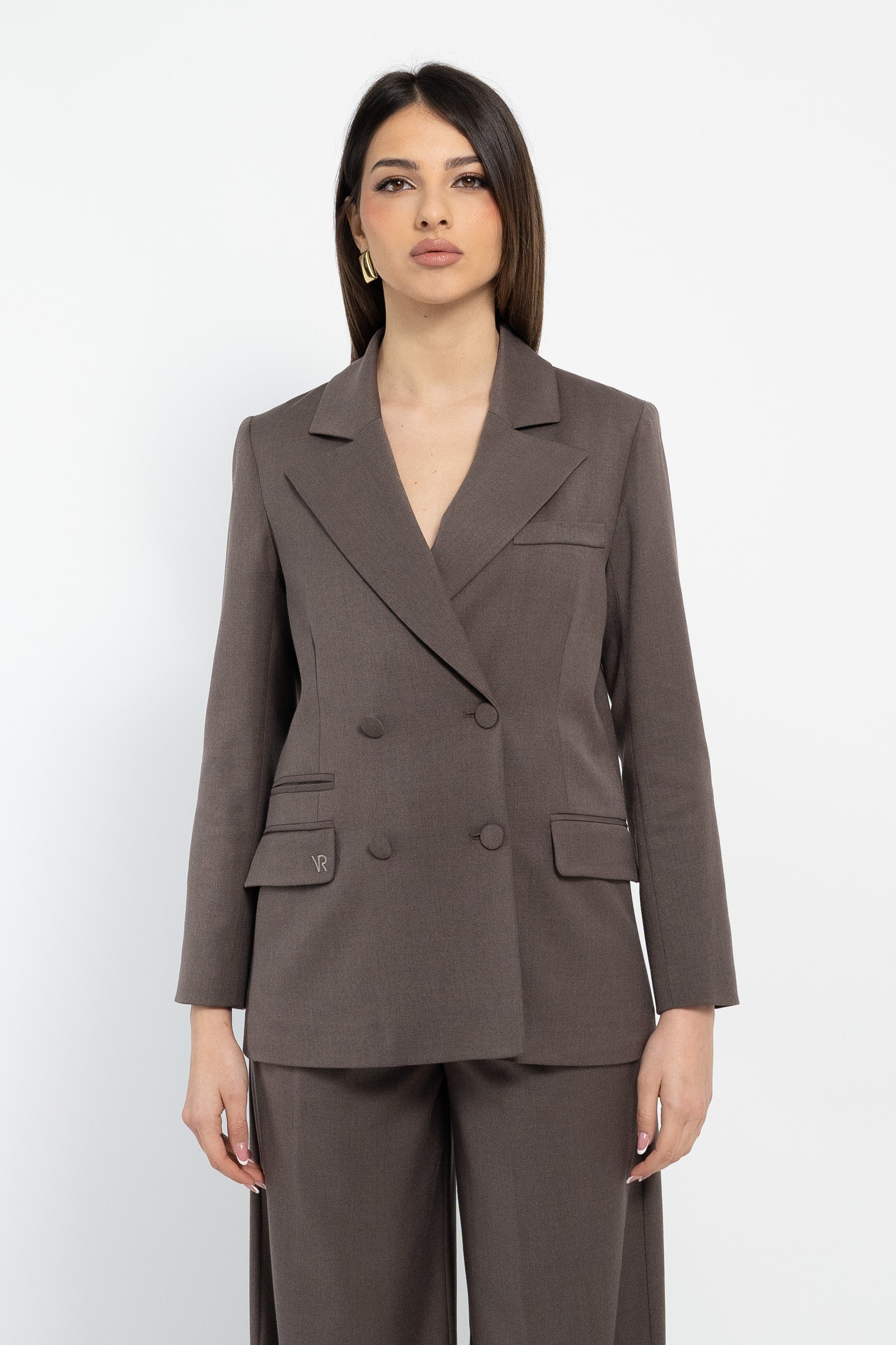 Giacca doppiopetto in flanella, linea dritta, con taschino, friso, patte con ricamo VR, bottoni personalizzati e spacchetto sul centro dietro.