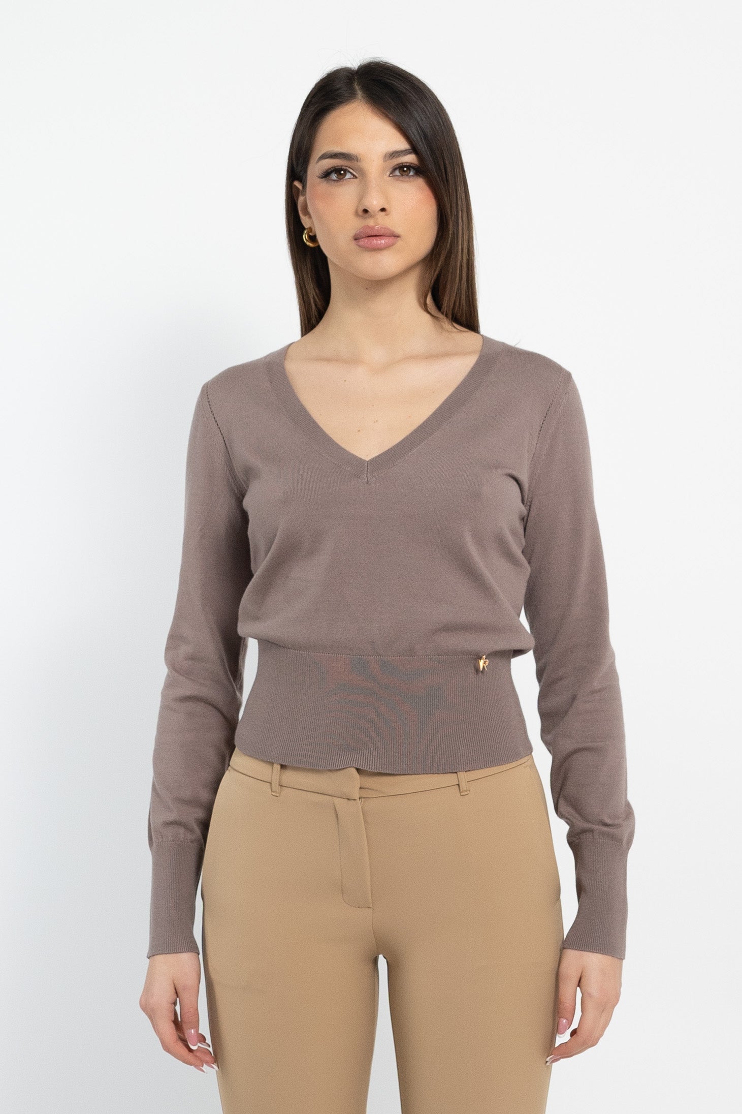 Maglia basica con scollo a V, punto traforato sul giro e costina alta in vita.