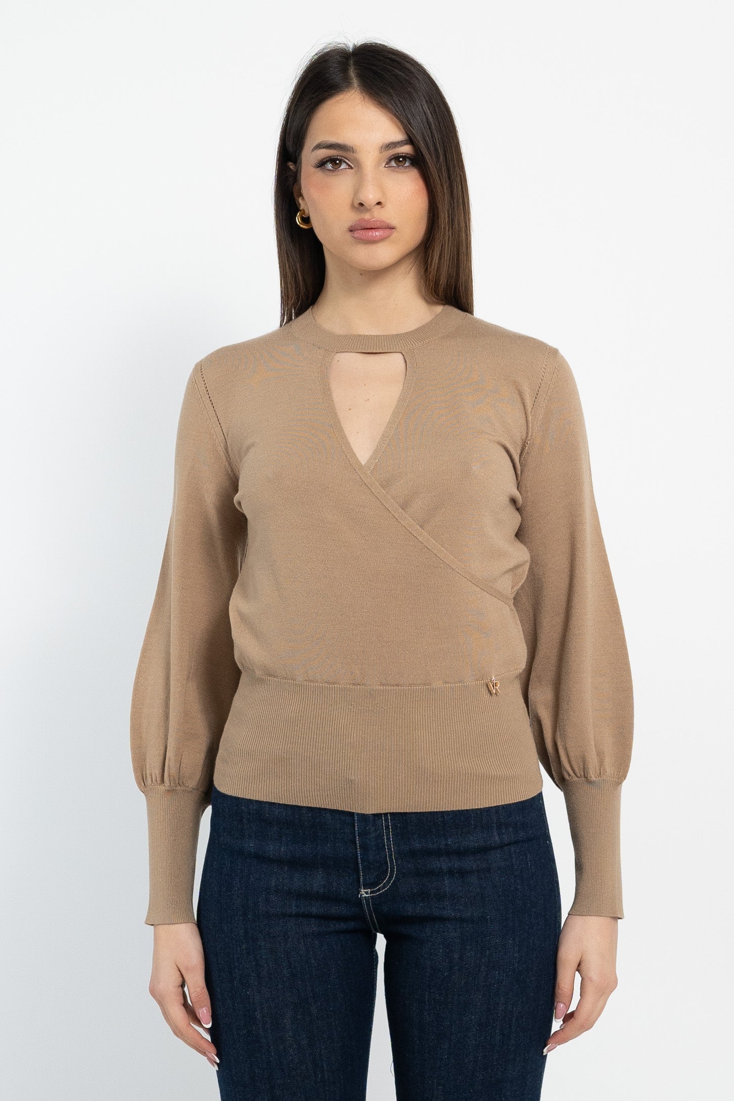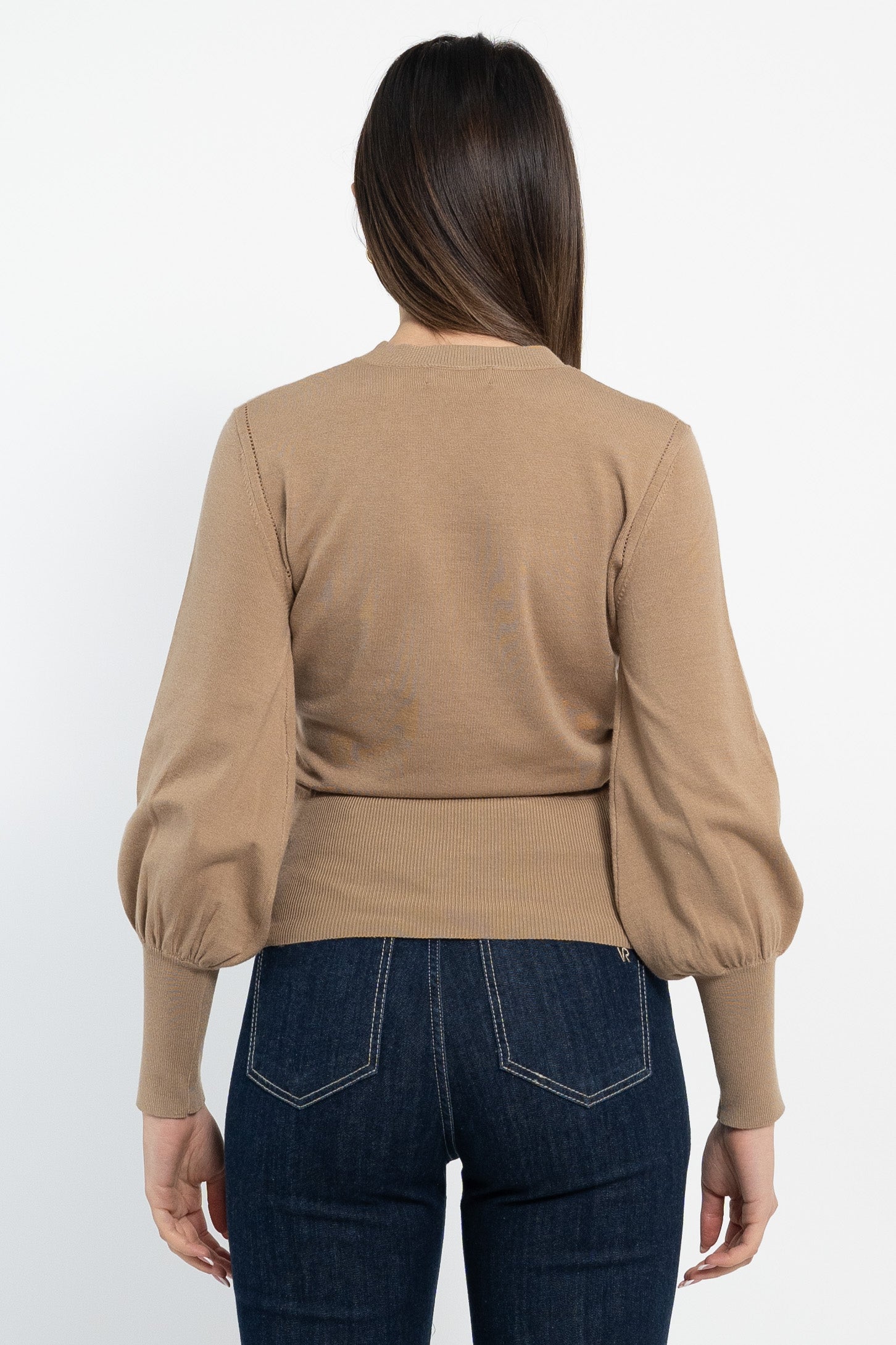 Maglia finto incrocio con maniche a sbuffo, apertura sul davanti e costina alta in vita.