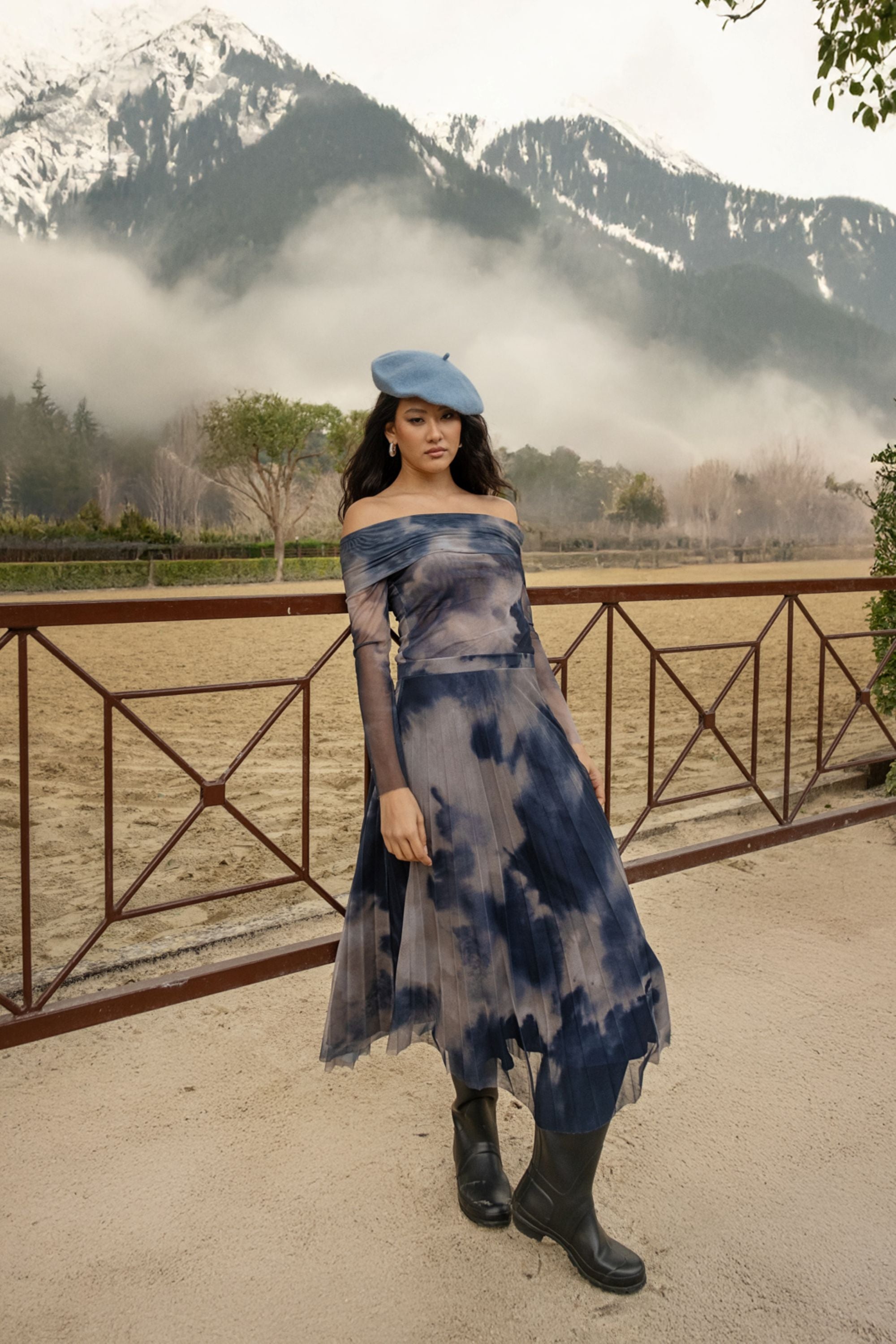 Maglia in rete stampata , manica lunga e scollo bardot.