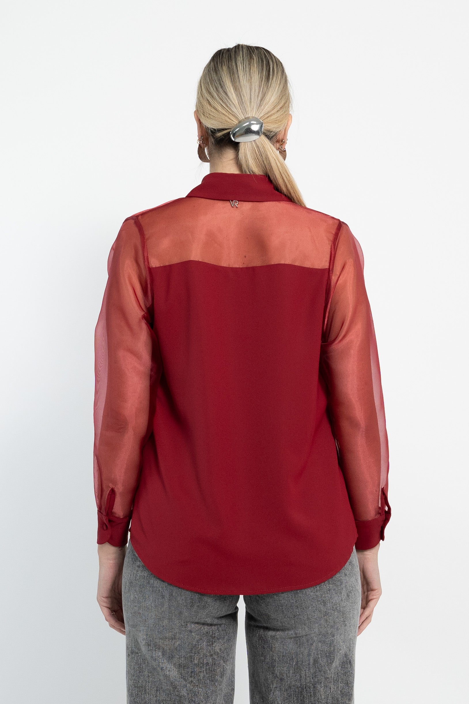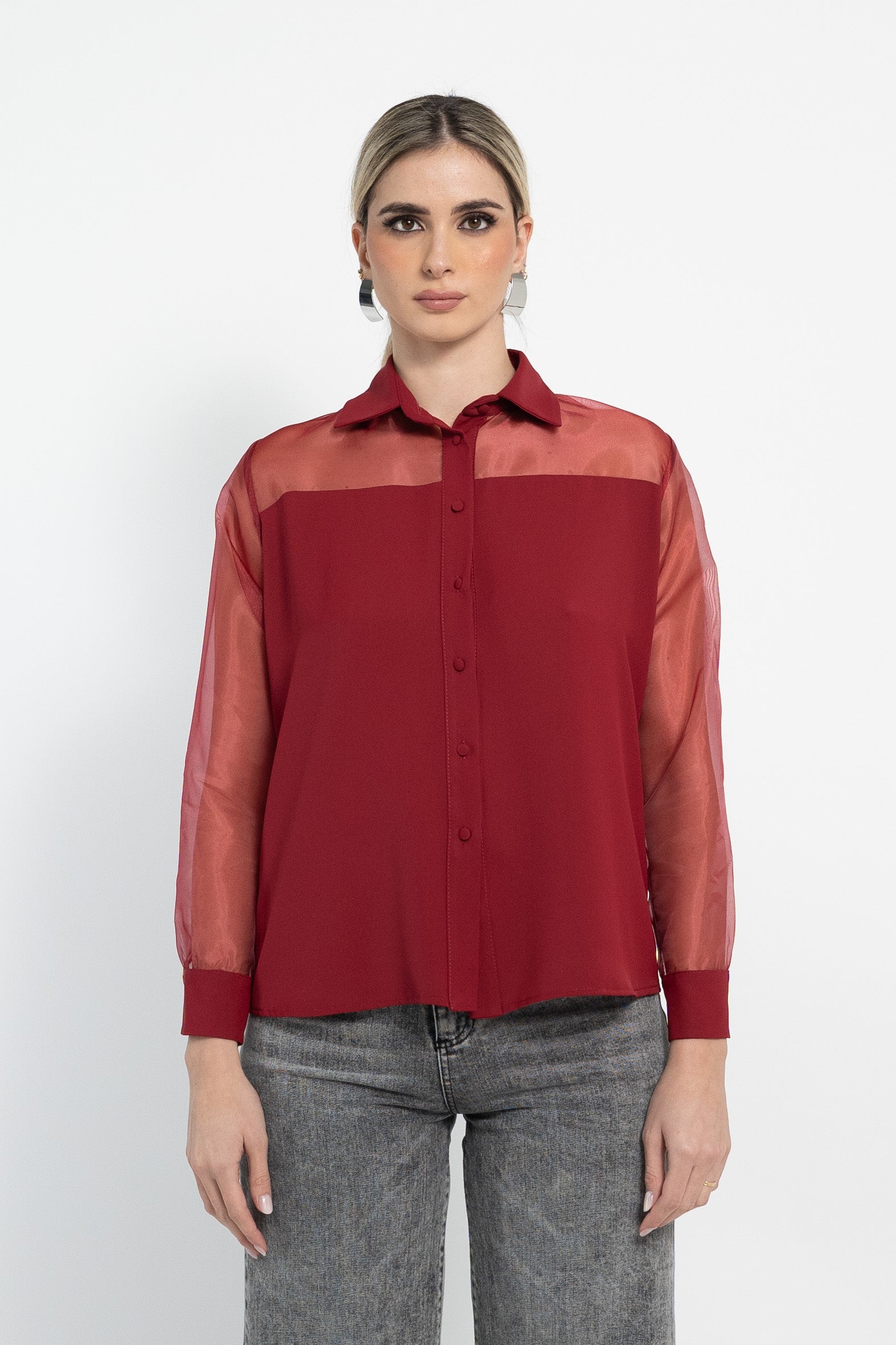 Camicia basica in raso matto con inserti in organza e bottoncini ricoperti in tessuto.