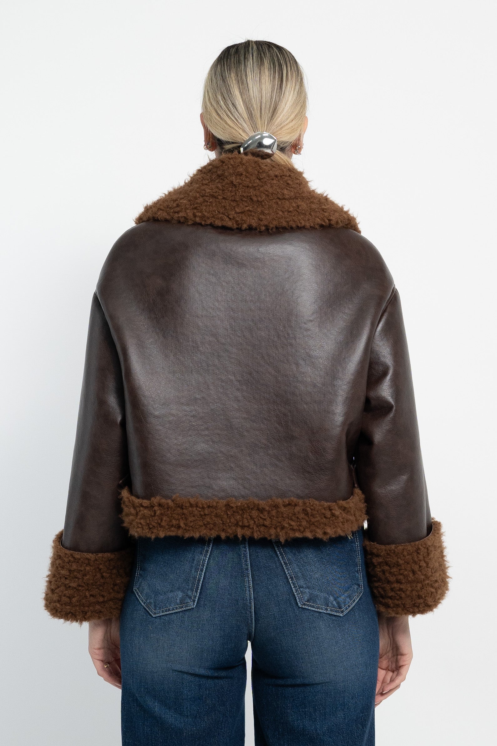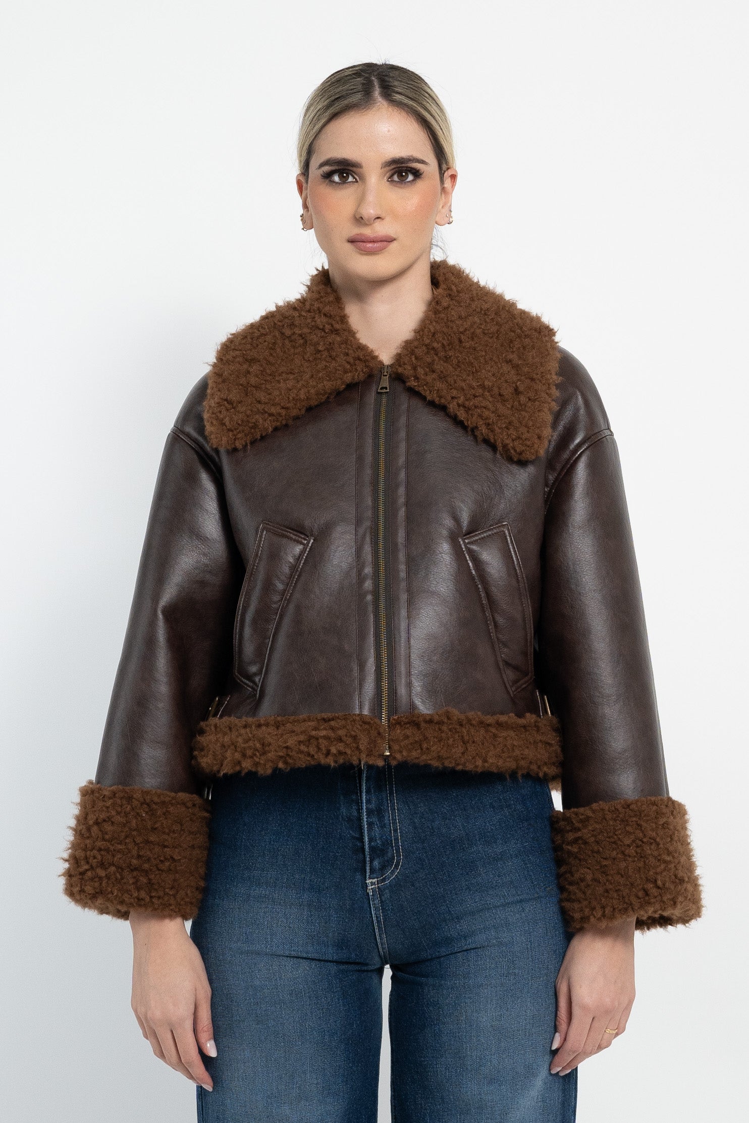 Montone corto in pelle con colletto ampio, spalla scesa, manica ampia, tasche a friso, zip sul