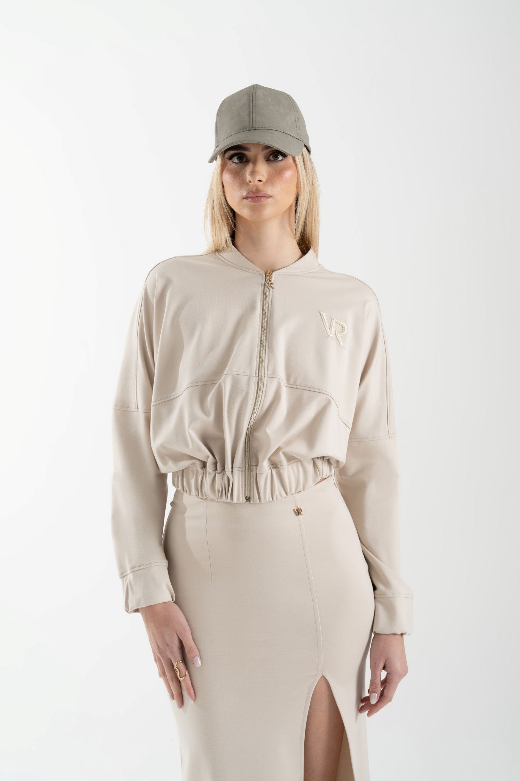 Felpa over in punto milano con zip e cursore personalizzato VR, spalla scesa, elastico al fondo e fondo manica. Ricamo VR maxi sul lato.