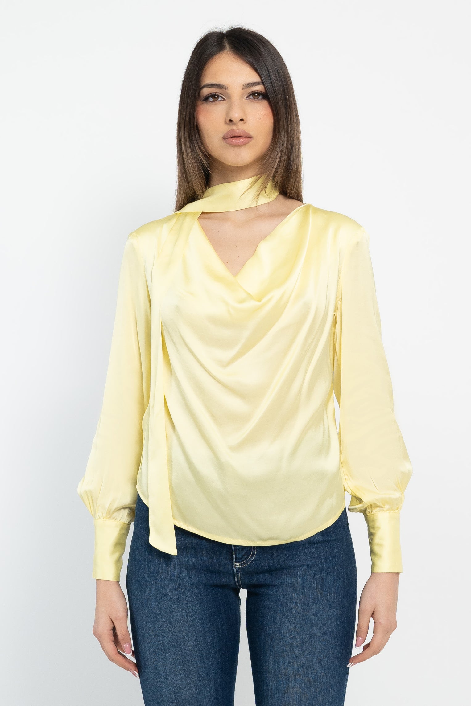 Blusa in raso di viscosa con bocca, manica a sbuffo, polsino alto e sciarpetta separata.