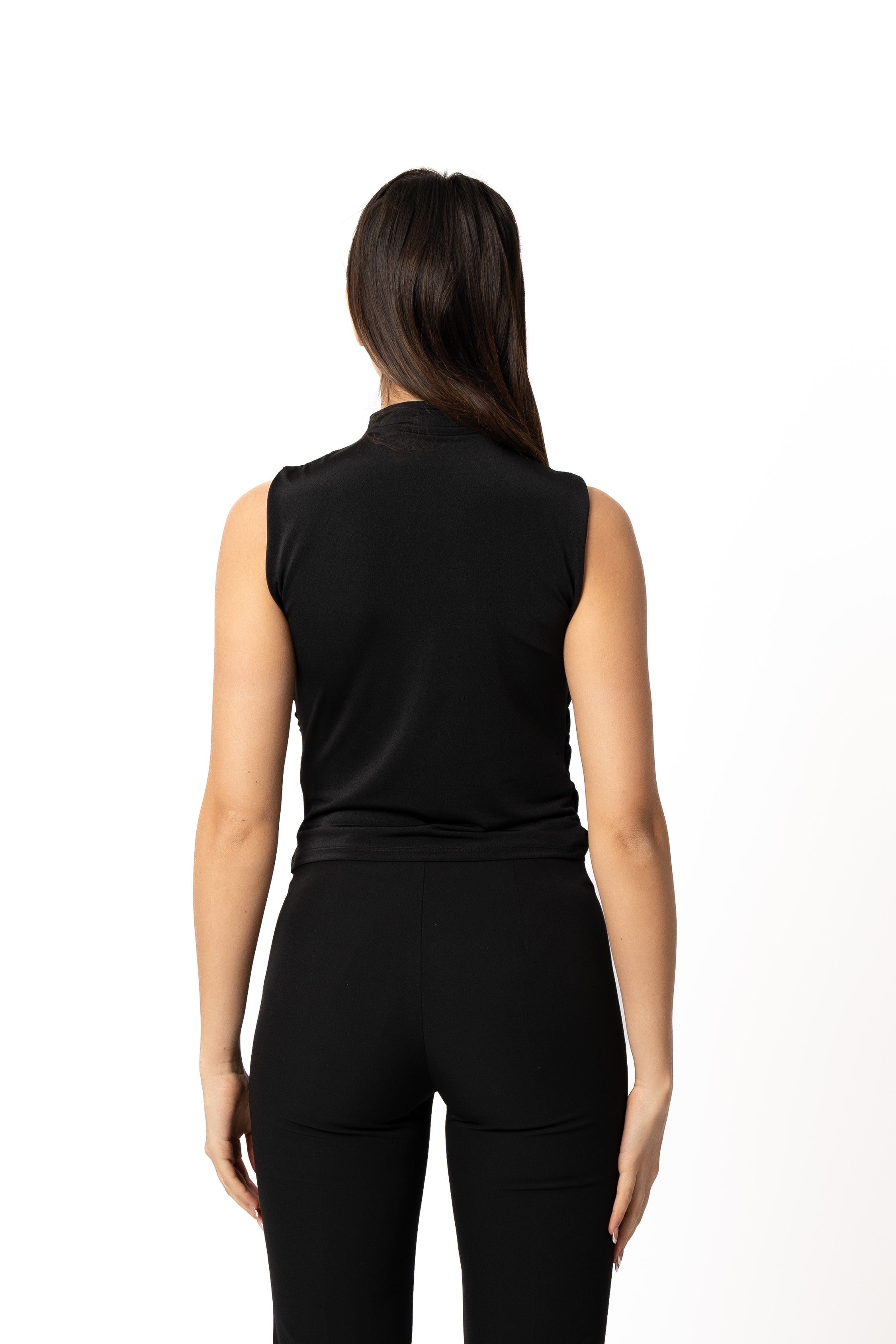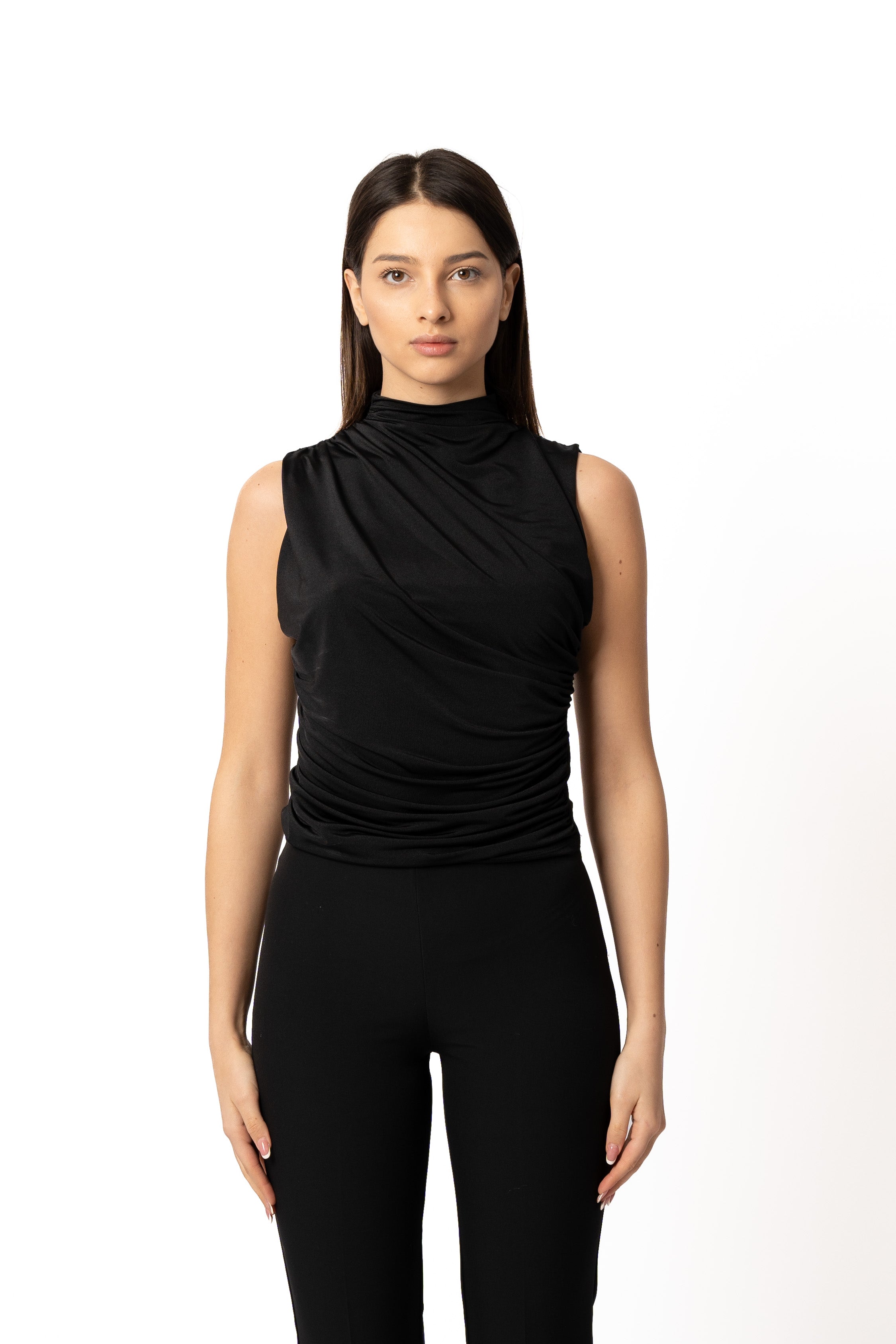 Top in jersey lucido giromanica, con collo cratere, arricci laterali.