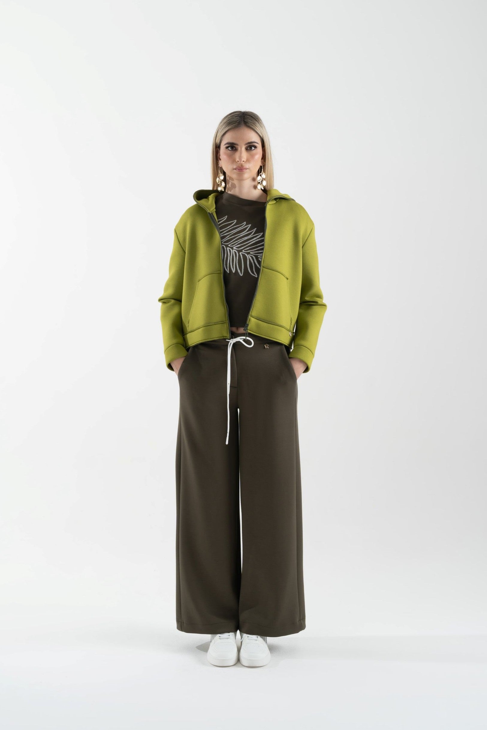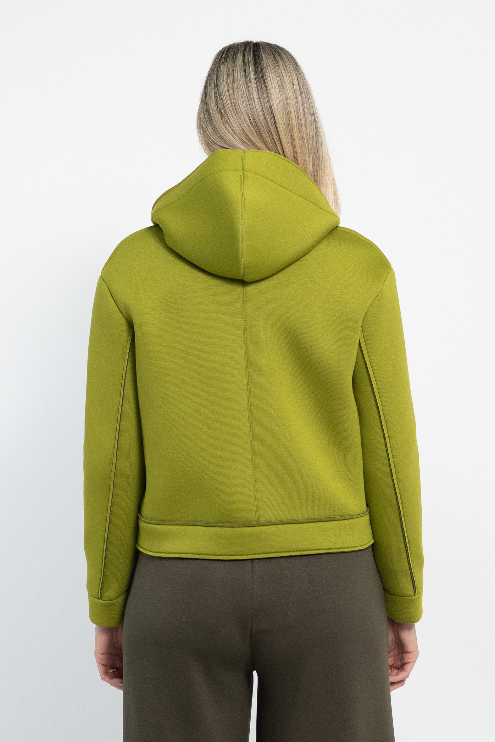 Felpa over in tessuto neoprene con zip, cappuccio e tasconi sul davanti, rifinita a taglio vivo e impunturata.