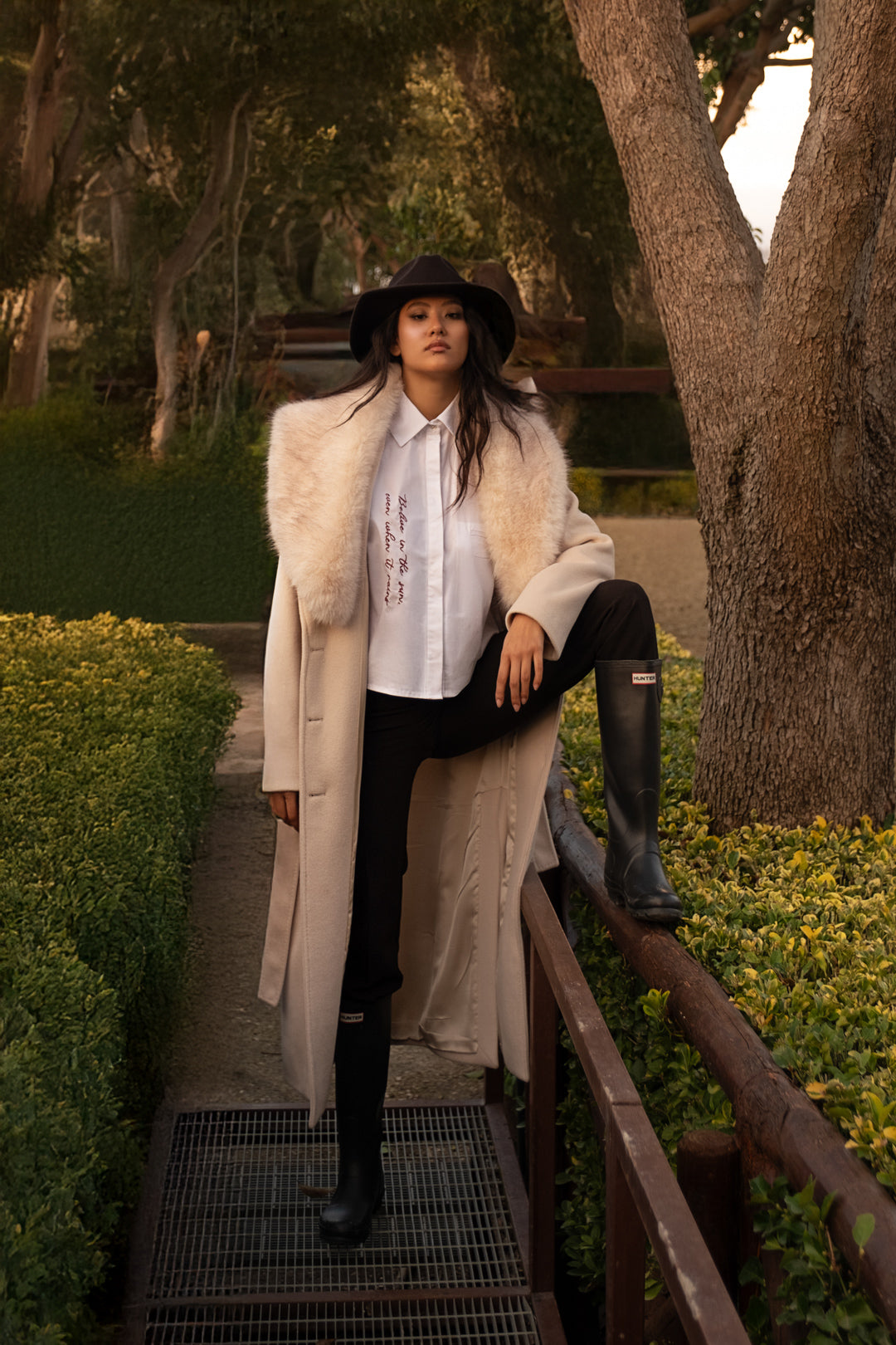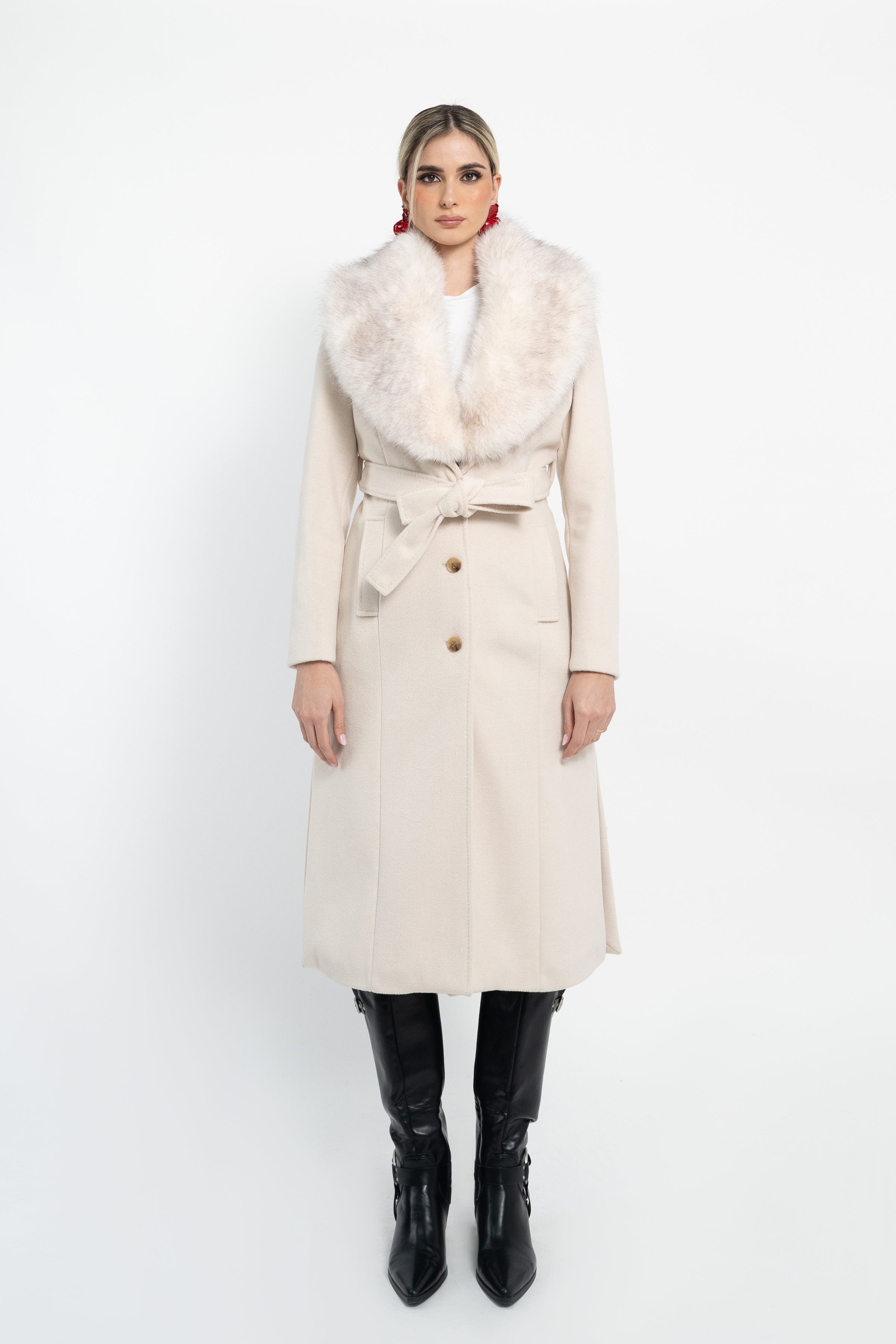 Cappotto lungo in panno, con collo pelliccia stacccabile, rever, cintura e tasche impunturate.